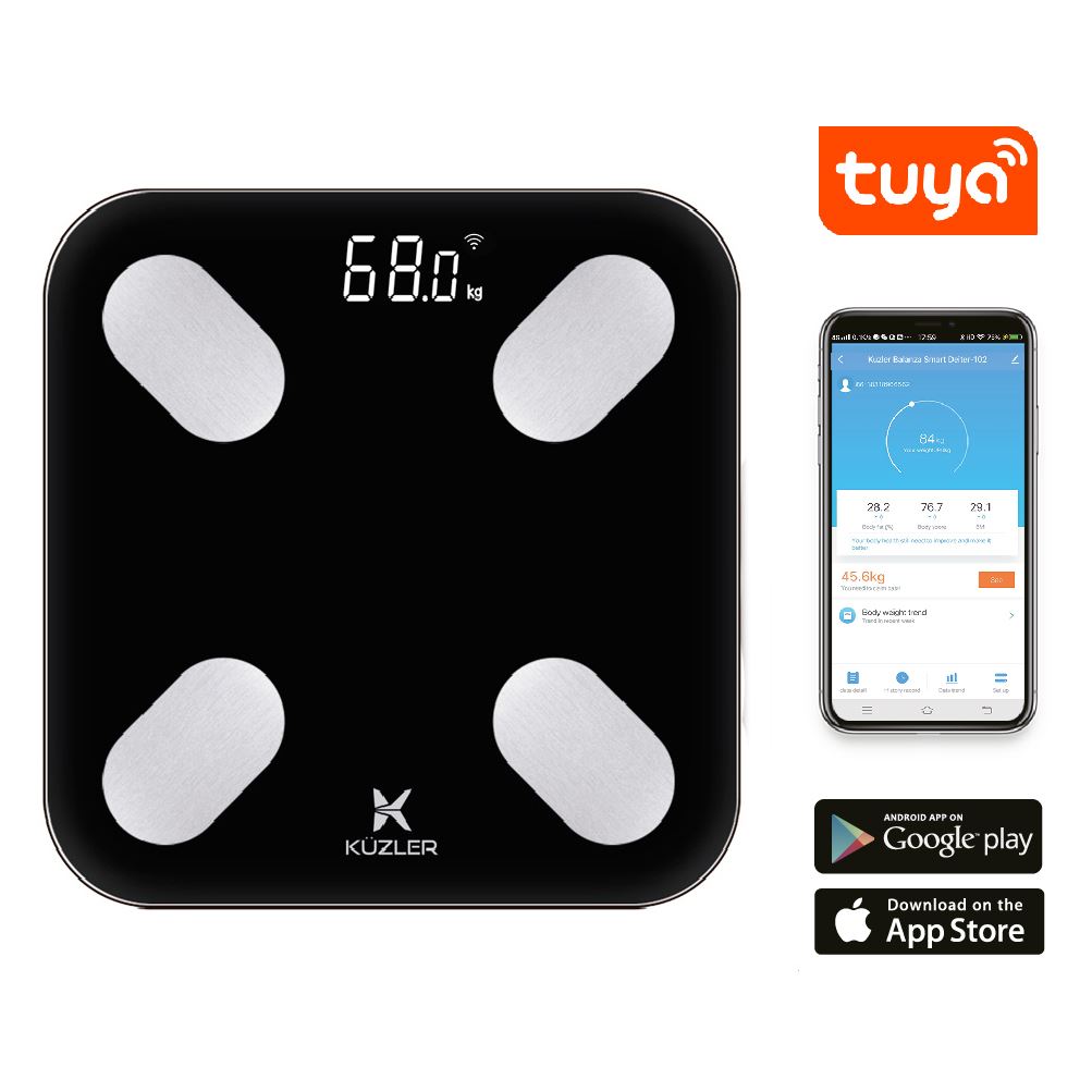 Configuración rápida y fácil: Conexión vía WiFi con el App celular Tuya Smart. Se sincroniza con Apple Health, Google Fit, Fitbit. Puedes ver tus resultados en la aplicación segundos después de pisar la balanza.