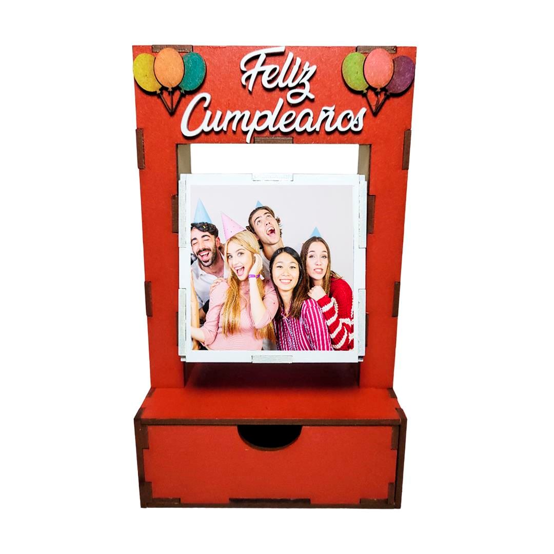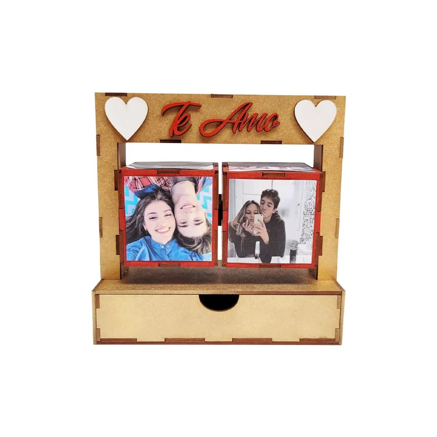Cubo doble porta fotos elaborado en MDF, un material de madera resistente y versátil. Pueden colocar las fotos de su elección.