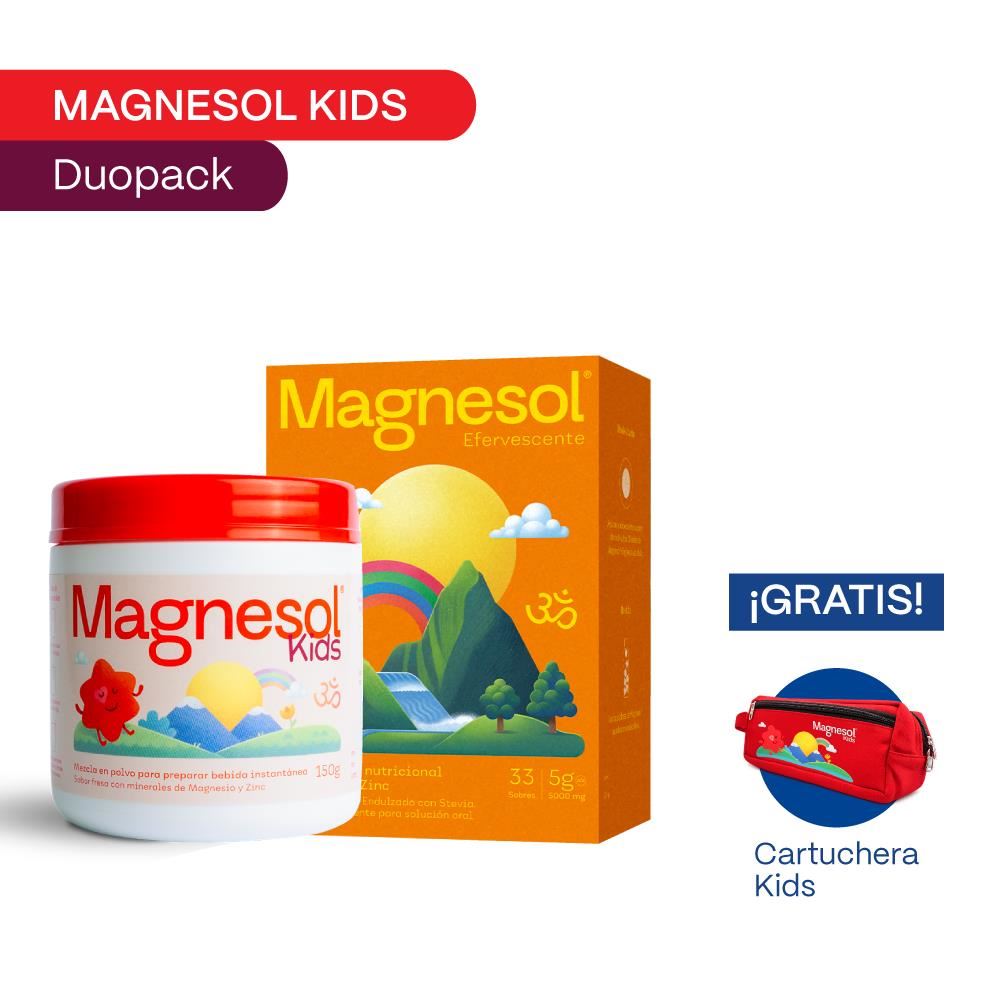 Magnesol es un Suplemento Nutricional en base a Magnesio y Zinc elaborado bajo altos estándares de calidad. Beneficios del Magnesio: Ayuda a Equilibrar el Sistema Nervioso, Contribuye a dar Vitalidad y Energía, y es un Aliado para la prevención de tu salud. Precauciones y Advertencias: El uso en embarazo y Lactancia deberá ser bajo el control de su médico tratante.Magnesol kids es una mezcla en polvo para consumo como bebida instantánea, con sabor a fresa que proporciona magnesio y zinc para el crecimimiento y desarrollo de los niños.Precauciones y Advertencias: Es importante consultar con un médico antes de tomar MAGNESOL KIDS si el niño tiene alguna condición médica. No recomendado en pacientes con insuficiencia renal.